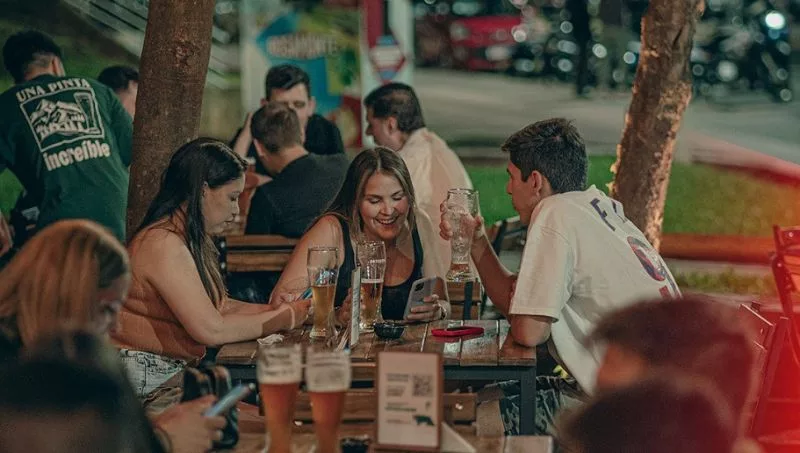 En cuanto a la propuesta gastronómica, hay opciones para compartir, como la tabla de fritos o la parrillada, platos principales como la hamburguesa de picanha, y variedades de sándwiches, hamburguesas, papas con salsas, y las tradicionales pizzas y empanadas.