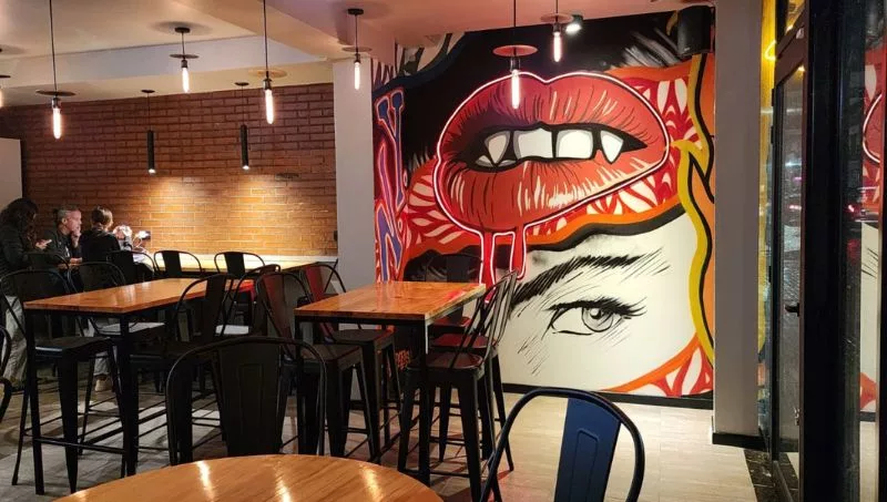 El local mantiene el estilo de la marca, con los graffitis característicos, luces de neón y música urbana, que transportan a la Gran Manzana. Apenas se entra, puede verse de frente la vitrina de la barra, que expone las once variedades de pizzas. La mayor parte de las sillas de hierro y mesas de madera convocan grupos grandes, aunque hay espacio para quienes buscan mayor intimidad, como el sector de sillones. En total, hay espacio para 40 comensales sentados, ya que la propuesta también invita a disfrutar de la pizza al paso.